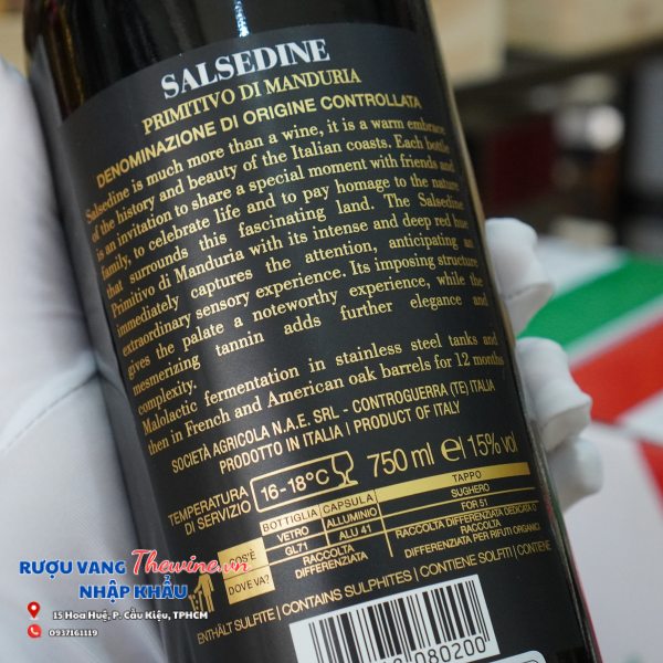 SALSADINE không chỉ đơn thuần là một chai vang, mà còn là bản giao hưởng tinh tế của lịch sử và vẻ đẹp thơ mộng từ những bờ biển nước Ý. Mỗi giọt Salsedine Primitivo di Manduria DOC 2022 là một lời mời chân thành để bạn cùng bạn bè, gia đình chia sẻ những khoảnh khắc đáng nhớ, tôn vinh cuộc sống và vẻ đẹp thiên nhiên hùng vĩ của vùng Manduria – trái tim của Puglia. Đây là biểu tượng cho niềm đam mê và nghệ thuật làm vang được truyền thừa qua nhiều thế hệ. Chai vang đỏ Salsedine Primitivo di Manduria 2022 ngay lập tức quyến rũ với màu đỏ ruby đậm sâu, hứa hẹn một trải nghiệm giác quan khó quên. Khi thưởng thức, bạn sẽ cảm nhận được tầng hương thơm phong phú của trái cây chín mọng như mận đen và anh đào, hòa quyện cùng những nốt hương ấm áp của vani, sô cô la và gỗ sồi tinh tế. Vị vang mạnh mẽ nhưng cân bằng tuyệt vời, với cấu trúc dày dặn, tannin tròn trịa, mượt mà lướt nhẹ trên vòm miệng. Hậu vị kéo dài đầy mê hoặc, để lại dư âm ngọt ngào và một chút khoáng chất đặc trưng của vùng đất duyên hải, khẳng định sự sang trọng và phức tạp của dòng vang DOC danh tiếng. Để tạo nên kiệt tác này, những trái nho Primitivo được tuyển chọn kỹ lưỡng đã trải qua quá trình lên men malolactic trong thùng thép không gỉ, sau đó được ủ ròng rã 12 tháng trong sự kết hợp hài hòa giữa thùng gỗ sồi Pháp và Mỹ. Quy trình tỉ mỉ này không chỉ giúp rượu phát triển độ sâu và đa dạng hương vị mà còn làm mềm mại các tầng tannin, mang lại một tổng thể hài hòa và đầy cuốn hút. SALSADINE Primitivo di Manduria DOC 2022 là sự kết tinh của nghệ thuật, truyền thống và niềm tự hào của nhà sản xuất Società Agricola N.A.E. SRL, mời gọi bạn khám phá tinh hoa vang Ý trong từng giọt rượu.